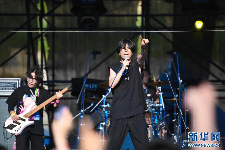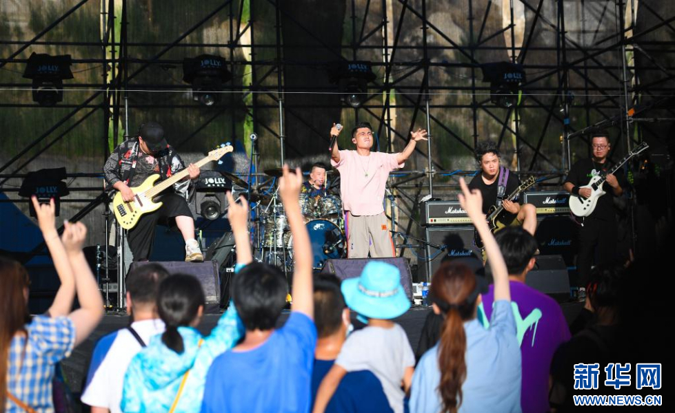 7月17日,在辽宁阜新百年国际赛道城,乐队在阜新草莓音乐节现场表演。 当日,2021阜新草莓音乐节在辽宁阜新的百年国际赛道城开幕,本次音乐节将持续至7月18日。 新华社记者 蔡湘鑫 摄