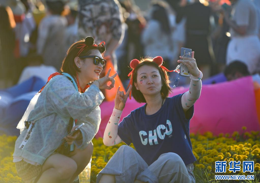 7月17日,在辽宁阜新百年国际赛道城,观众在阜新草莓音乐节现场拍照留念。 当日,2021阜新草莓音乐节在辽宁阜新的百年国际赛道城开幕,本次音乐节将持续至7月18日。 新华社记者 蔡湘鑫 摄