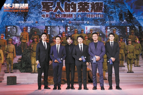 8月1日是八一建军节。当天下午,“军人的荣耀——电影《长津湖》八一特别节目”在中国电影博物馆举行。总制片人于冬,总监制及编剧黄建新,监制及导演陈凯歌、徐克、林超贤,历史顾问王树增,领衔主演吴京、易烊千玺,特别主演段奕宏等出席活动,他们在现场动情地分享了影片的幕后创作过程以及对角色的理解。右图为《长津湖》主演合影。