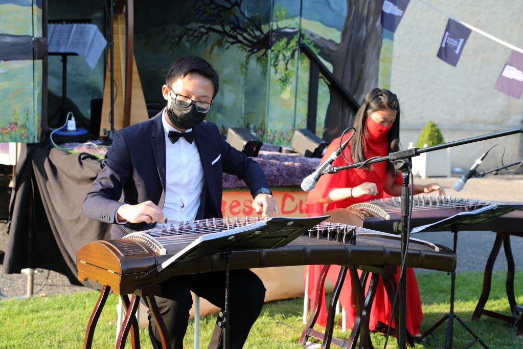 8月28日,两名表演者在爱尔兰都柏林的爱尔兰现代艺术博物馆弹奏古筝。 由中国驻爱尔兰大使馆、当地侨社和爱尔兰文化部门联合主办的“中国文化路演”户外音乐表演活动28日在爱尔兰首都都柏林和周边地区举行,活动受到当地民众的热烈欢迎。 新华社发