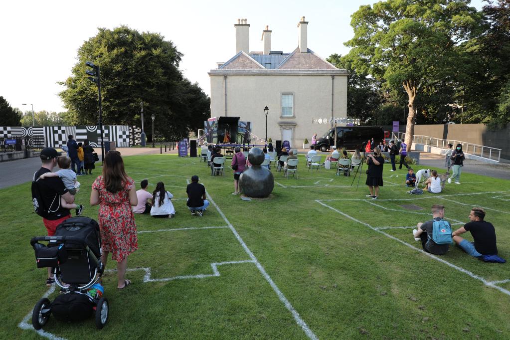 8月28日,人们在爱尔兰都柏林的爱尔兰现代艺术博物馆欣赏“中国文化路演”户外音乐表演。 由中国驻爱尔兰大使馆、当地侨社和爱尔兰文化部门联合主办的“中国文化路演”户外音乐表演活动28日在爱尔兰首都都柏林和周边地区举行,活动受到当地民众的热烈欢迎。 新华社发