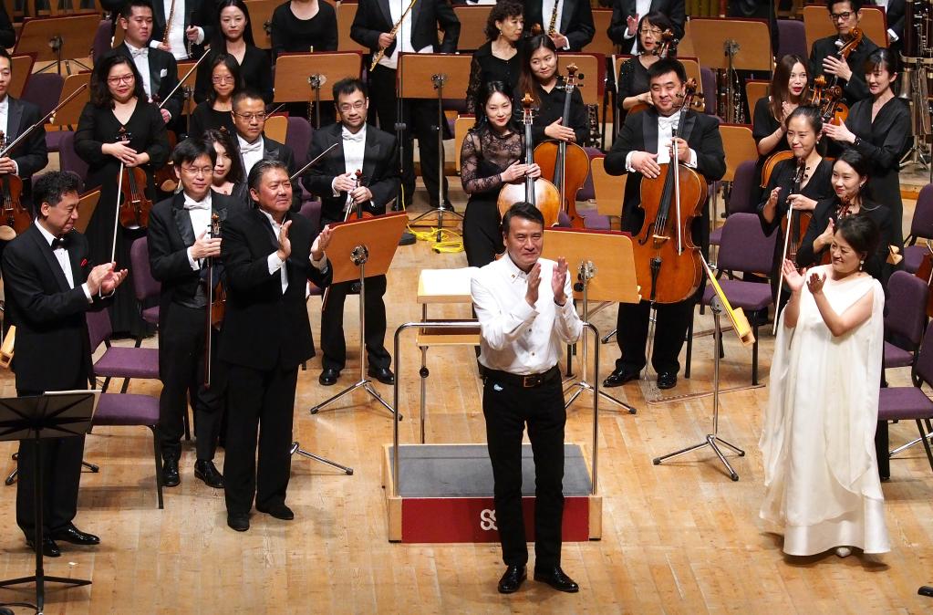9月4日,作曲家叶小纲(前中)在其作品《大地之歌》演出结束后登台向乐团和听众致谢。新华社记者 任珑 摄