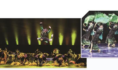 蕉叶掩映船屋前,一位黎族老婆婆安静制陶,而一众黎族“拜扣”(黎 族语“女人”)各自抚陶,迈出轻盈的舞步,好不闲适!随后画面一转,在“裸眼3D”幕布打造的热带雨林中,“帕曼”(黎族语“男人”)唱起歌谣,一幅充满沉浸感的狩猎图呈现在观众眼前。一个半小时的演出中,从神话到器乐,从舂米狩猎的劳作日常,到对歌嫁娶的特定习俗,黎族独特的民族舞蹈语汇、深厚的文化内涵与现代舞美三者有机统一,令身处繁华都市的上海观众目不暇接,充分领略“南溟之甸”人文风物的绚烂斑斓。