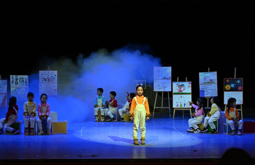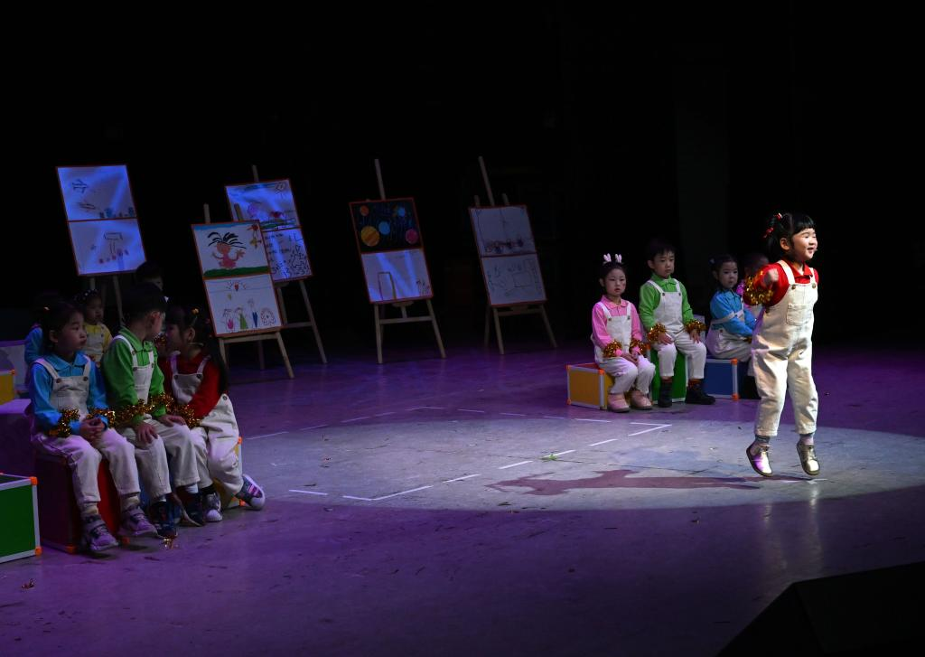 1月16日,小朋友在台上表演。当日,北京儿童艺术剧院语言与表达班在北京举行汇报演出。孩子们通过戏剧课堂的启发,围绕“幸福是什么”这一主题,以原创诗歌的形式开展表演。新华社记者金良快摄