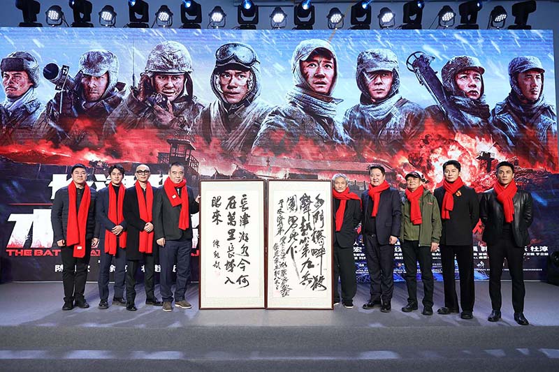 陈凯歌和徐克导演还带来了亲笔写下的书法作品,为电影送上祝福。陈凯歌导演写下“长津湖水今何在,万里长城入眼来”,将浓烈的家国情融入其中;徐克导演用“水门桥畔杀声起,第九兵团男儿心”表达了对志愿军战士的诚挚敬意。