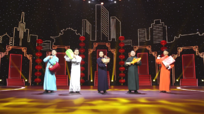 今年的“年夜饭”舞台有些不一样。节目以“饭小二”为线索人物贯穿全场,并且首创了“五福临门”的元素概念,搭建了五个梦幻“传送门”,穿梭在同一时段的祖国各地,带着观众“沉浸式逛庙会”,在“菜市场”里感受地道年味,给冰球队的娃娃送大餐,探访不同地方的人们如何准备年夜饭,呈现一台色香味俱全的视听盛宴。