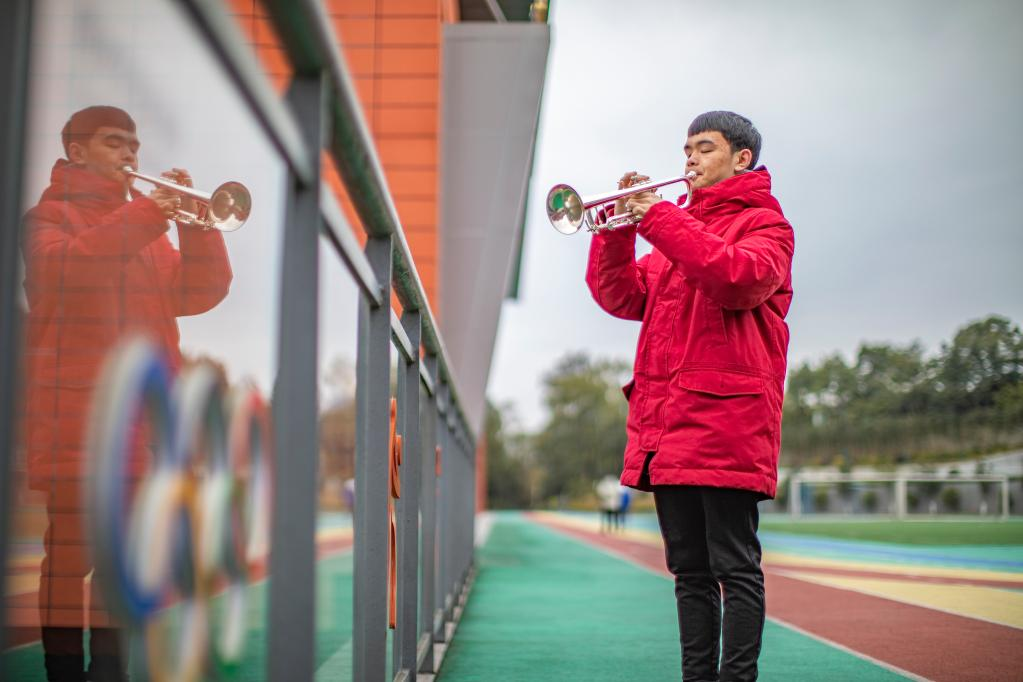 手指在乐章上摸索学习,手指也在小号的按键上上下飞舞。展现出音乐天赋的王太樊,几乎把课余时间都花在了音乐上。他说,每次吹起小号,他都觉得有一束光从头顶上照下来,照亮他脚下的路,也照亮他的内心世界。“音乐让我明白,失明没什么可怕的。只要心是雪亮的,世界就会对你微笑。”