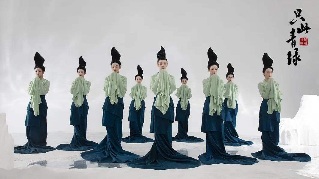 不得不说,《只此青绿》与端午假期的适配度很高。很多网友是去年买的南京场演出票,而演出两次因疫情延期,不弃不离才蹲到端午上演。端午正值仲夏时节,流行色刚好是青绿色。青色是中国传统五色之一,《释名》云:青,生也,象物生时色也。古人常把青绿二字共用,代表生机,比如刘禹锡的“苔痕上阶绿,草色入帘青”;《诗经》里的“瞻彼淇奥,绿竹青青”,是草木生长茂盛的样子。