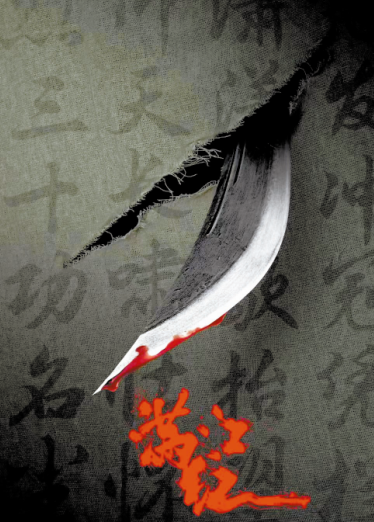 在影片概念海报上,写着《满江红·怒发冲冠》词句的屏风被一把鲜血淋漓的弯刀刺破,鲜红的“满江红”三个大字力透纸背。整张海报色调阴暗,充满悬念,透过刀缝窥见的屏风之后,一片黑暗,让人想要一探究竟。