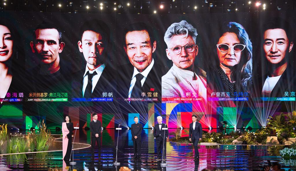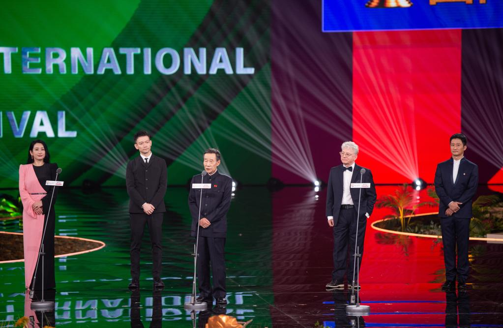 8月12日,“天坛奖”国际评委会成员秦海璐(左一)、郭帆(左二)、李雪健(中)、柯文思(右二)和吴京亮相开幕式。