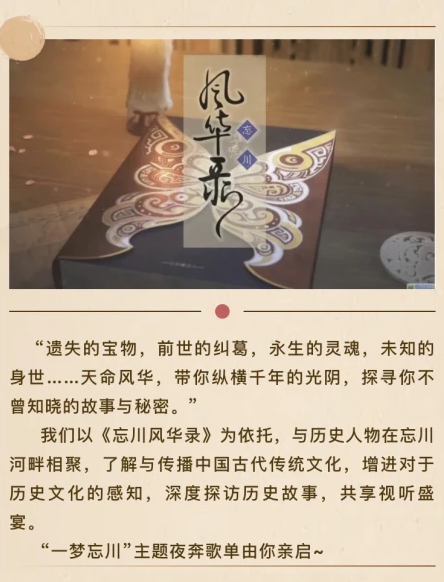 《忘川风华录》手游将五千年浩荡中华历史中的名人汇聚一堂,玩家可以与李白月下饮酒,与嬴政坐论天下,尝苏东坡美食,赏王羲之书法……与名士们共居忘川桃源。千古风流拍岸,大梦归忘川,新的瑰丽画卷和动人故事就此徐徐展开。其创作的角色曲,如《木兰行》、《天下局》、《如见青山》等也广受年轻人喜爱,目前其音乐账号粉丝数已经突破了75万,全网总播放量超过亿次。
