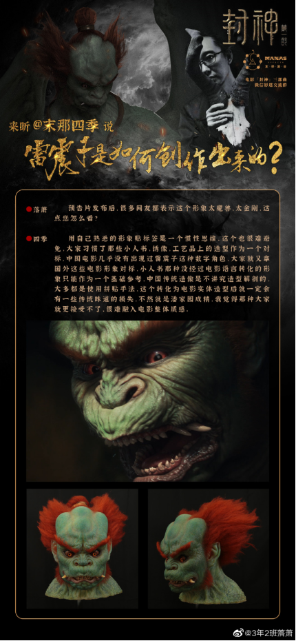 首先感谢乌尔善导演的信任与帮助,让我们从热爱传统文化的雕像艺术工作室,成长为可以一力承担《封神三部曲》数字生物概念设计、以及特效妆造道具制作的末那众合;前后四年多的时间里不仅仅是众多优秀艺术家们的磨合和碰撞,更是一群纯粹封神原著粉的精神狂欢,但同时也带来了一些不得不面对的问题: