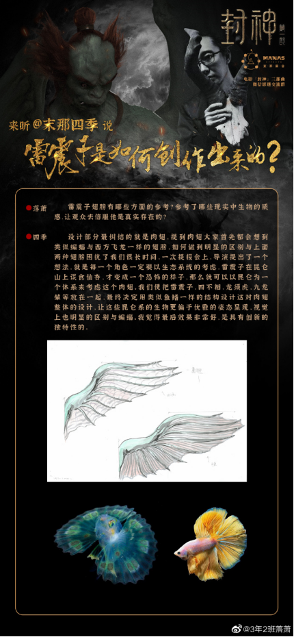 最后还是乌尔善导演提出每个角色的设定要归属其生态系统,要保持一个系统内的统一性——由于雷震子是在昆仑误食了仙杏,我们便把他和四不相、龙须虎、九龙撵等放在一起,将昆仑系的生物设定以更偏优雅的姿态呈现——最终决定以类似鱼鳍的结构来支撑这对肉翅,静态和动态视觉上与蝙蝠和飞龙都有了明显的差异性,我觉得最后的效果非常好、且具有创新的独特性。