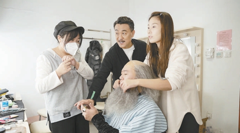 何冰(中)在化妆间指导演员定型。 苑晓辉摄