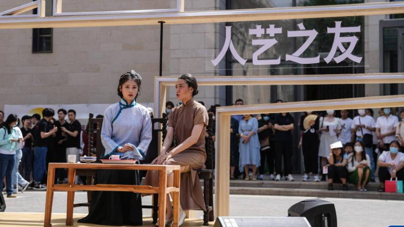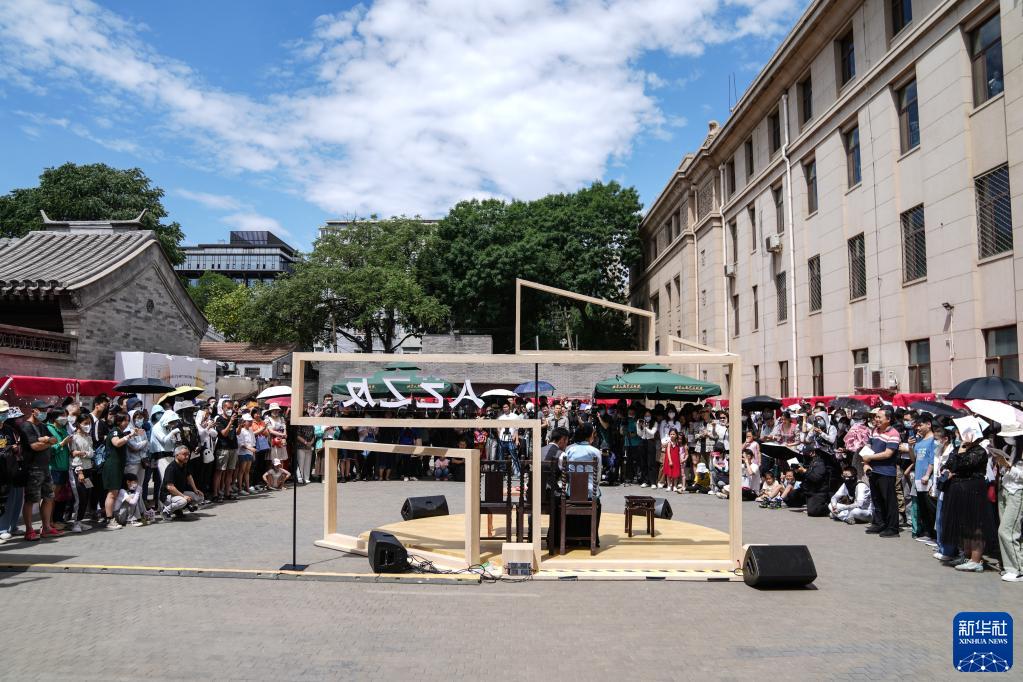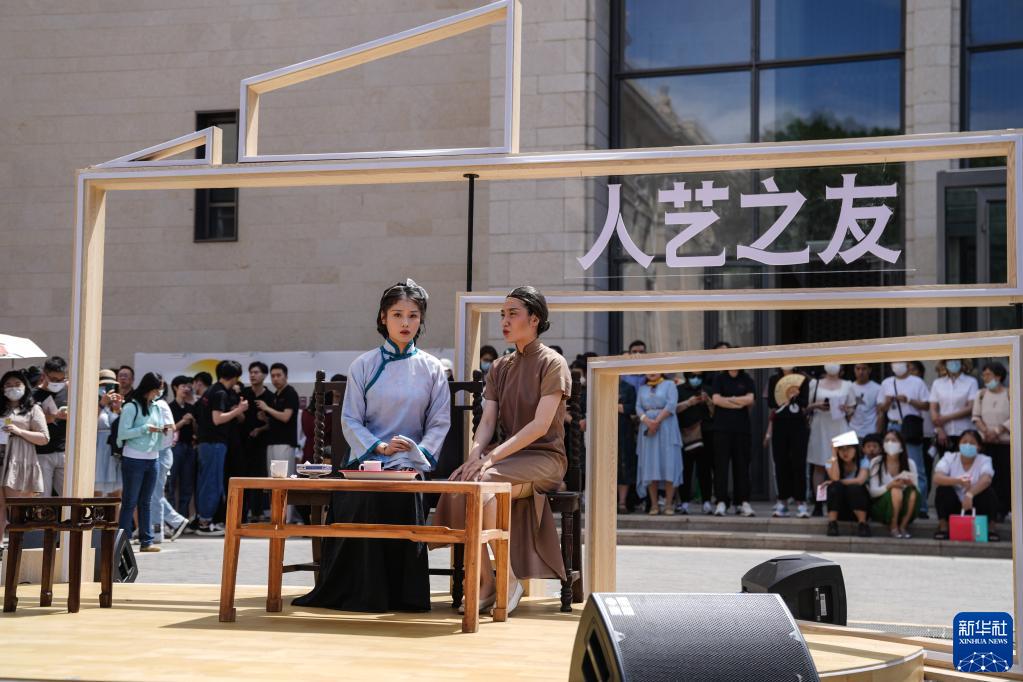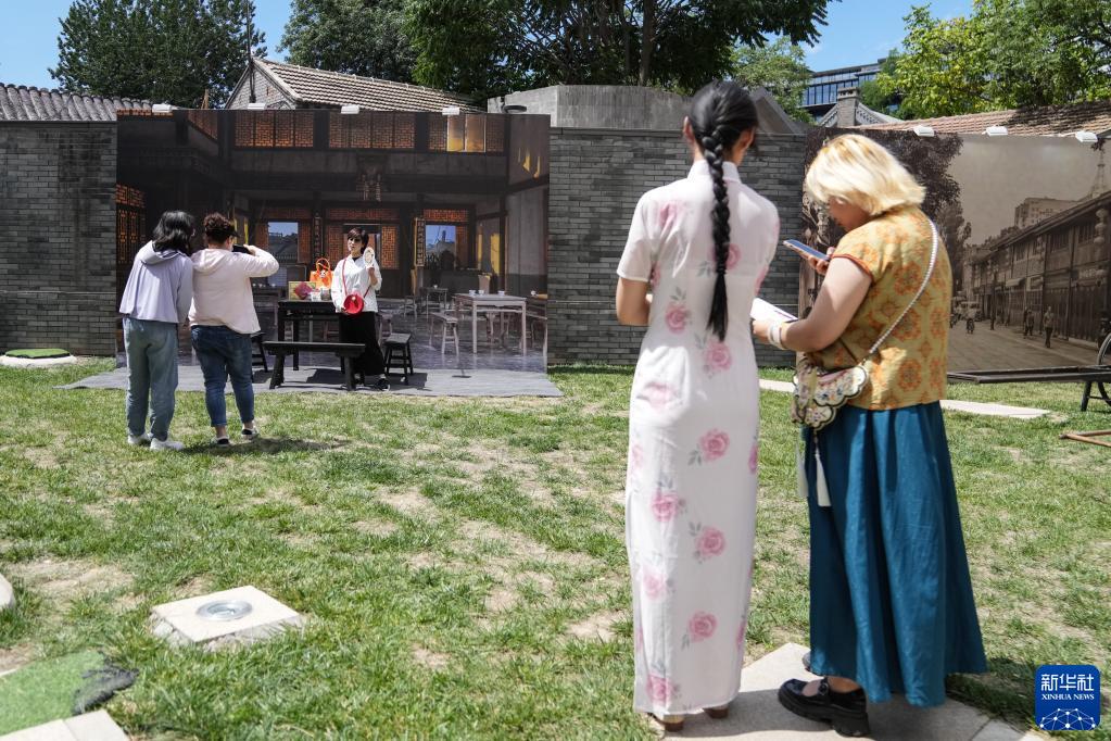 6月11日,观众在拍照留念。在建院71周年纪念日之际,北京人艺举办了“人艺之友日”,以精心组织策划的一系列主题活动,回馈观众的支持与热爱。此次 “人艺之友日”活动包含“戏剧记忆”“戏剧市集”“戏剧互动”“戏剧课堂”四大版块,有小型特展、戏剧快闪、群众演出、艺术家创作分享会、公益场演出等12项主题活动。丰富多样的活动形式是北京人艺基于自身剧场资源、艺术资源,进行深度开发的一次全新探索,更加强调观众的参与感、体验感。