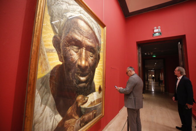 烈日下的一位老农,在劳动的间隙手捧粗瓷碗准备喝水,大颗晶莹的汗水流过他脸上深深的沟壑。展览展出的罗中立油画《父亲》以纪念碑式的宏伟构图、超写实的手法,饱含深情地刻画出中国农民的典型形象。1980年,罗中立以《父亲》震撼中国画坛,并获第二届全国青年美展一等奖。数十年来,这张脸庞深深打动了无数中国人的心,成为改革开放以来中国现实主义艺术创作的一道丰碑。