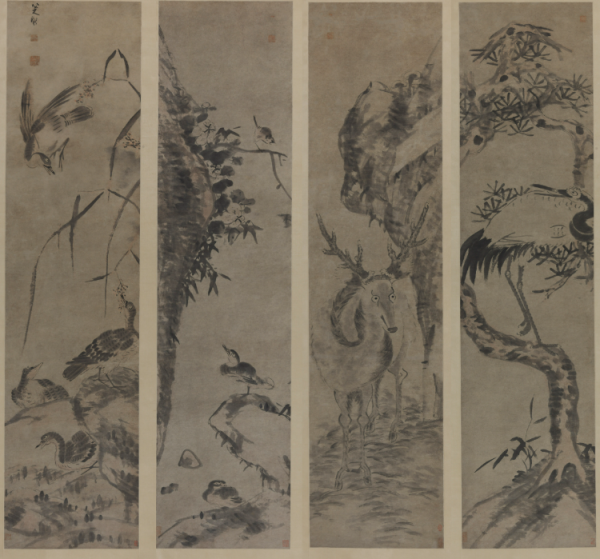 八大山人朱耷创作《鹤鹿凫雁图》每轴独立成像,分别描绘了鹤、鹿、凫、雁。从署款“八”呈两点,并改“画”为“写”来看,应是其70岁之后的佳作。屏中每个形象均作“白眼”状,彼此间还似乎相互顾盼。白眼是一种孤高、孤傲的自我表达。但八大山人对世事的孤冷与不屑,也建立在他对世界充满童真和天趣的艺术人文温度。历经人生坎坷的他最后归于平和,既严肃、又幽默地表达自己的情感。