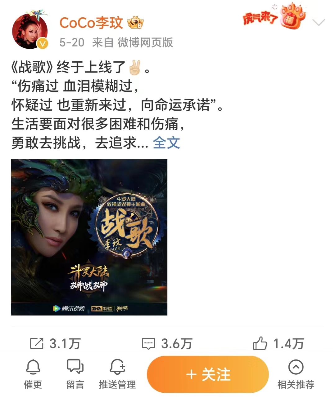 5月20日,新歌《战神》上线。李玟的微博也停留在了这一天。