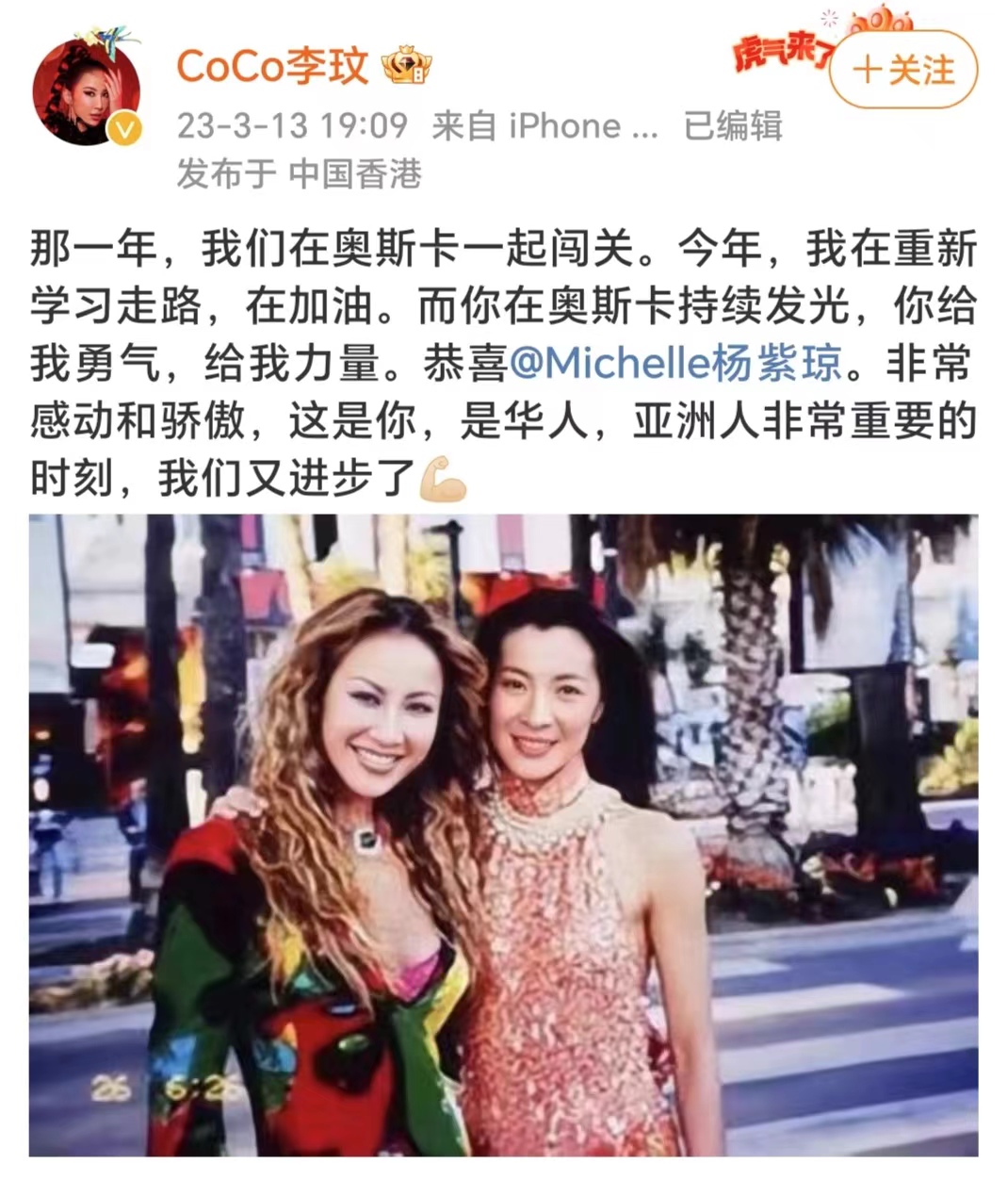 3月13日,李玟更新微博,恭贺杨紫琼获奥斯卡金像奖,成为首位华裔影后。