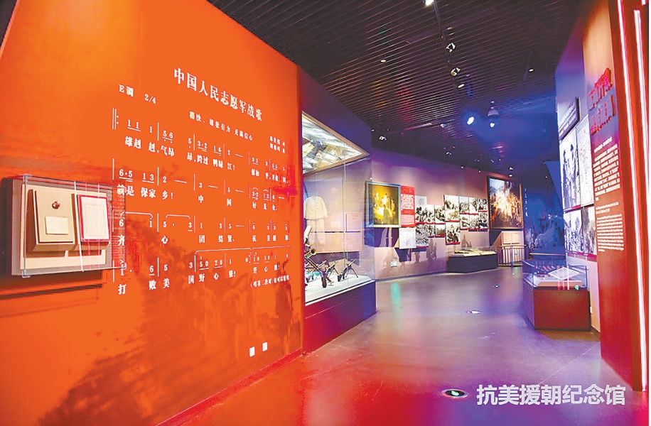抗美援朝纪念馆中,“战歌”书写在一面展墙上,周巍峙曲谱手稿一同展陈。 供图/抗美援朝纪念馆