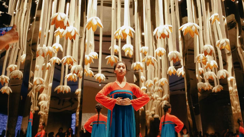 在展览开幕日,展厅内上演了精彩的器乐演奏和舞蹈表演,将艺术空间进一步激活。作品《花的精神》由三个艺术场景空间组成,其中在《绒之百花·春之镜像》空间里缤纷垂落的绒线花束与《莲之镜像》中垂落的陶瓷莲花下,两位舞者同时上演了双独舞作品《俑Ⅲ-唐乐宫图》。此段舞蹈由北京舞蹈学院田湉编舞,取材于中国古代历史名画,给观众带来与剧院观演完全不同的感受。
