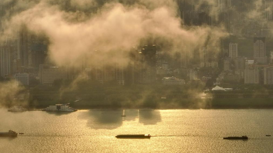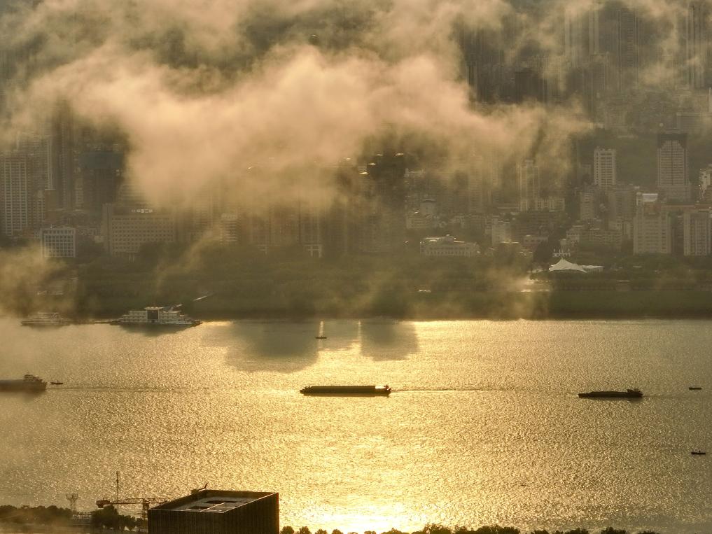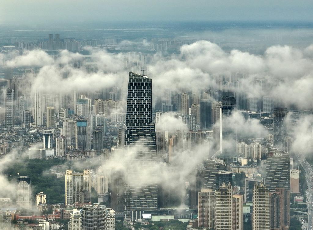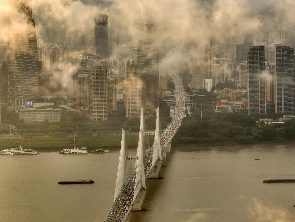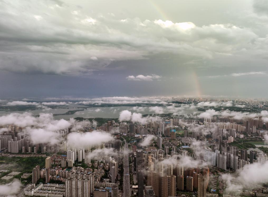 7月19日,湖北省武汉市雨后天晴,城市与云海、彩虹相映成趣,如梦如幻。 新华社发(赵军摄)