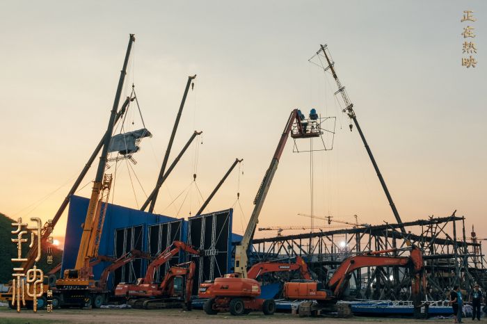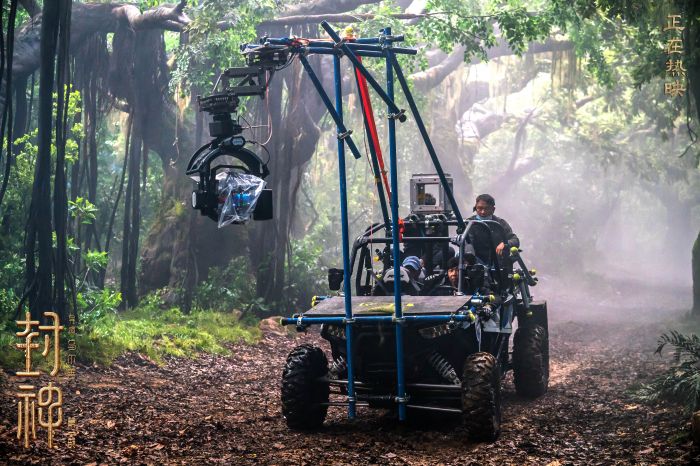 由于电影中有冀州城之战等马术战争戏,运动范围大,对蓝幕的需求量也大,最难解决的是蓝幕长度和高度的问题,最终机械组选用了一个相对灵活的方式:用挖掘机改装移动蓝幕。导演乌尔善在特辑中介绍:“我们做的这个移动蓝幕,把那个挖掘机斗拆掉,用桁架做成蓝幕方框,它可以随时地移动。”每次转场时,规模庞大的移动蓝幕挖掘机队伍也成为《封神三部曲》片场一道独特的风景。
