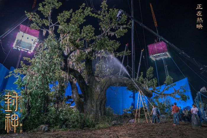 为提高拍摄效率,导演乌尔善透露,剧组做了一些很重要的探索:“首先是在我们拍摄的主要的摄影棚,专门搭了为灯光工作的桁架,就不用在现场来改变灯的位置,这是一个非常高效率的工作方式。”场景美术团队在一万平米的摄影棚里搭建了饕餮追袭姬发的原始森林,而灯光组也要在万米摄影棚上面吊满了灯。摄影指导王昱在特辑里透露:“你看郝峰老师(灯光指导)正在装车,杀青那天他夸张地说我得装两个月,才能把这些灯运回北京。”