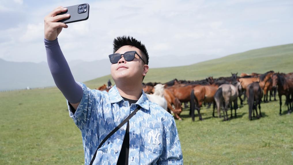 “好幸运!能够来到这里,见到这么美丽的草原和骏马!”来自台湾的新媒体人林惟纲举起手机,与风姿各异的骏马合影留念。