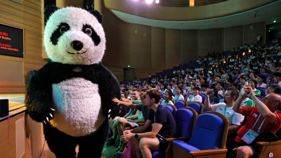 8月2日,一名演员装扮成大熊猫在演出间隙与观众互动。新华社记者 沈伯韩 摄