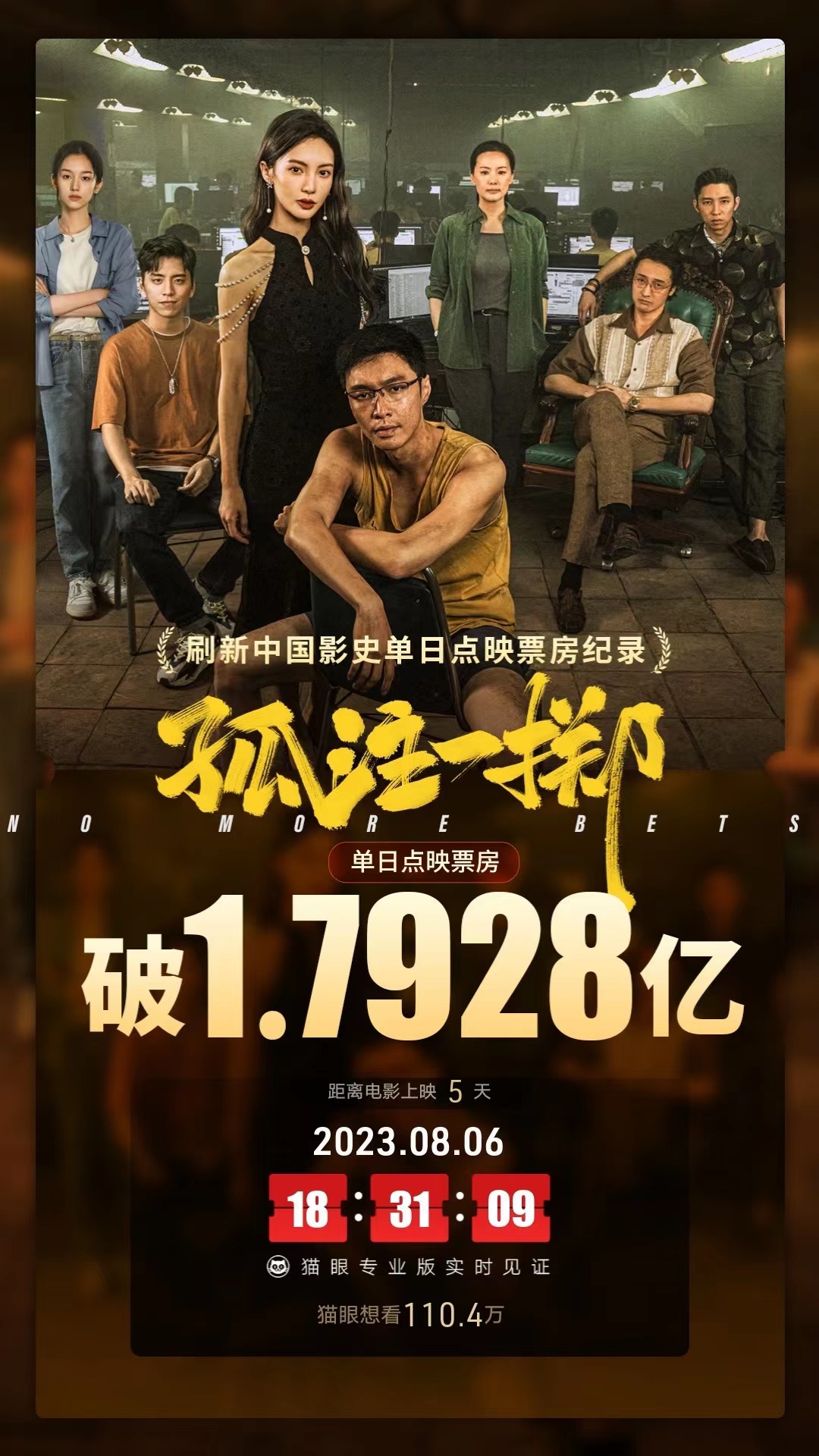 8月6日22时23分,影片《孤注一掷》点映票房数据突破2亿元,数据再创新高。 《孤注一掷》是由宁浩监制,申奥编剧执导,张艺兴、金晨、咏梅、王传君领衔主演,王大陆、周也特别出演,孙阳、邓萃雯主演的反诈骗犯罪片。该片于2023年8月5日至8月10日进行全国超前点映,8月11日在全国公映。 电影聚焦于当下屡禁不止的网络诈骗、网赌陷阱、招聘拐骗等跨国犯罪活动,取材自上万起真实诈骗案例,境外网络诈骗全产业链骇人内幕将在大银幕上被揭秘,程序员潘生(张艺兴 饰)、模特安娜(金晨 饰)被海外高薪招聘吸引,出国淘金,却意外落入境外诈骗工厂的陷阱……面对诈骗集团的折磨,他们会何去何从?