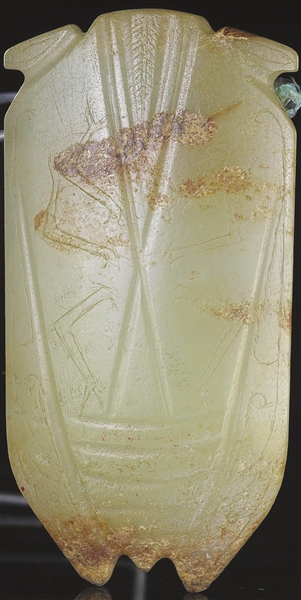 蝉是汉代玉器比较常见的一种题材。天博馆藏西汉玉蝉,淡青色,质地细密光润。蝉形为扁平状,中间稍厚。头部的双目外凸成方棱形,正面刻出双翅,尾和翅端呈三角形状,腹部刻出足纹。线条坚挺利落,细弱发丝,形象逼真,结构准确。此蝉无钻孔,当做专用的玉琀。