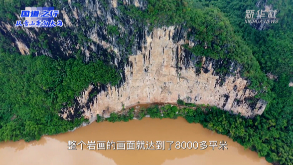 “国道之行 从雪山奔向大海”报道组在研究花山岩画30多年的广西宁明县文物管理所所长朱秋平带领下,来到花山脚下,听他讲述花山岩画的故事。