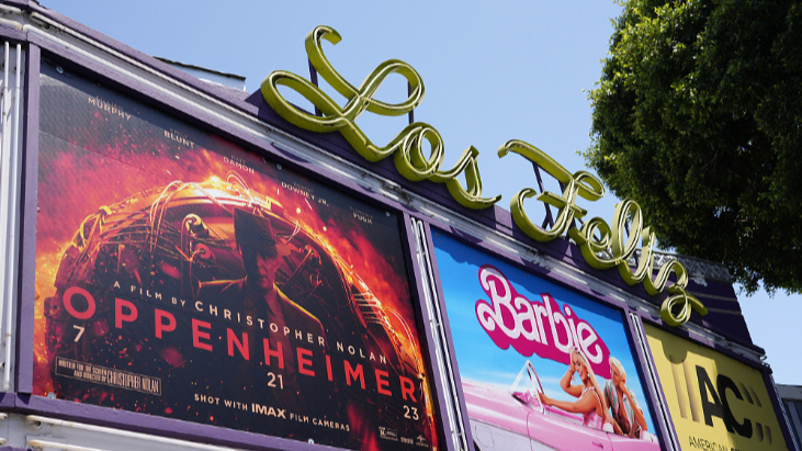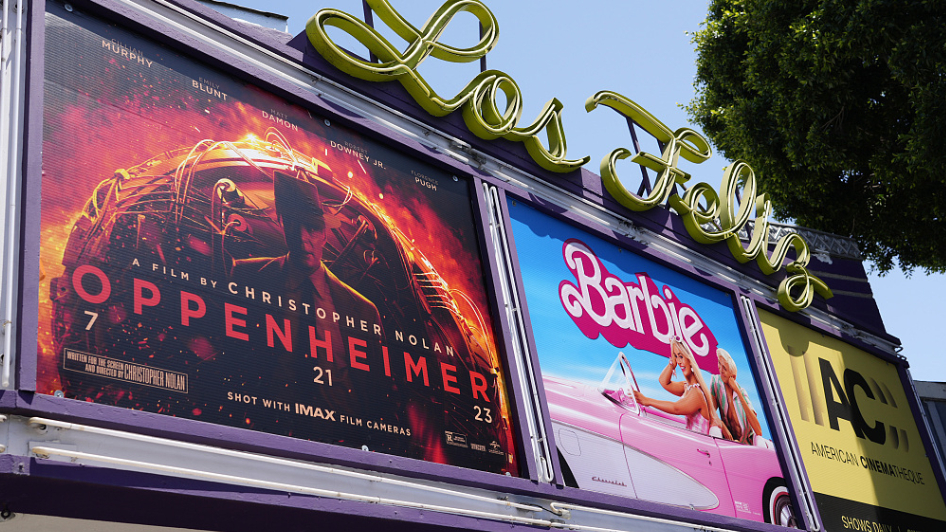 2023年7月28日,美国加州洛杉矶,剧院正在放映电影《芭比》和《奥本海默》。(视觉中国)