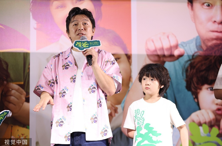 2023年8月17日,上海,主创单禹豪、黄渤亮相电影《学爸》首映礼。(视觉中国)
