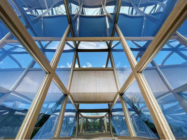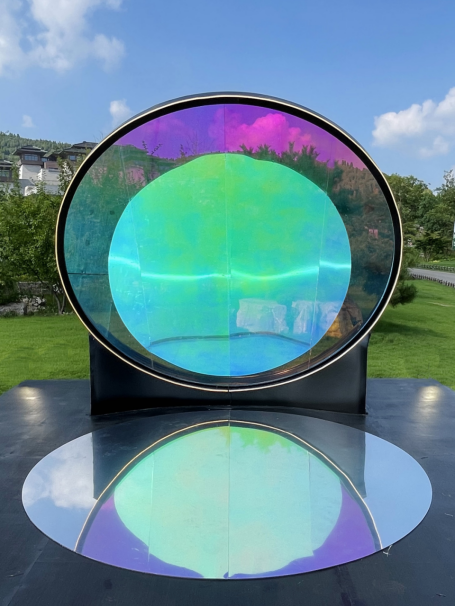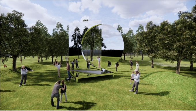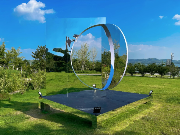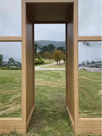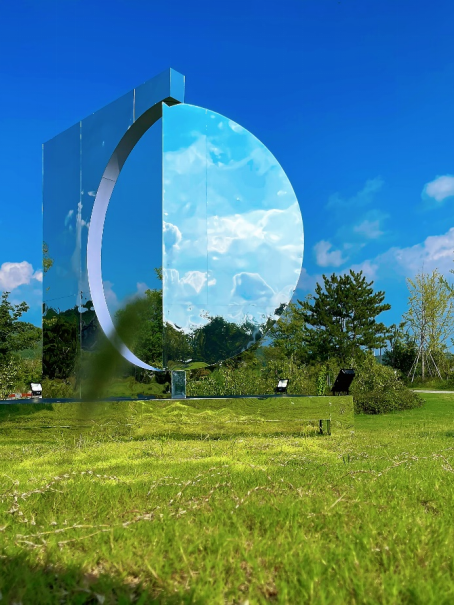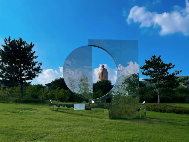 整个艺术装置由方形镜面及半圆镜面结构而成,借由镶嵌的可旋转半圆镜面使观者仿佛看到了许多真实与多层次的自我。子曰:“吾日三省吾身”,在尼山我们通过镜面装置与自己对话。半圆镜面以观者难以察觉的速度缓慢旋转,镜面旋转至不同角度映射出不断变化的人物及景物,产生一种微妙的现代与自然的融合质感,在彼此交融的过程里,真实空间与映射景象兼收并蓄一一纯粹的自然和真实的自我相互审视呼应,即重构和解构[自我],是动态也是静止。