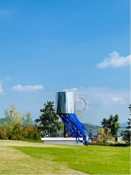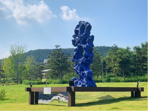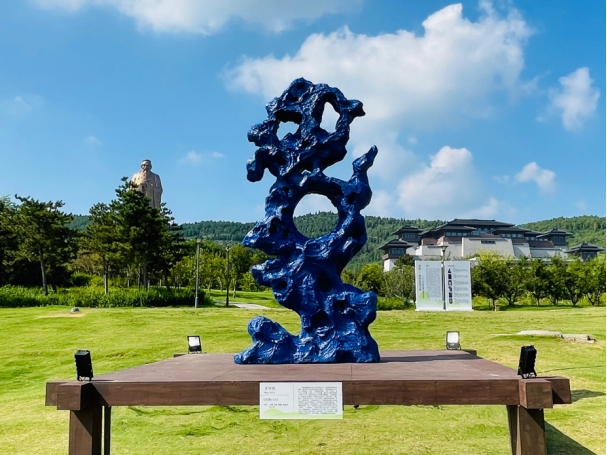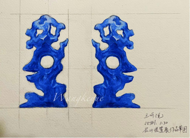 戏剧的精神实质是⽆限深遂宽⼴的,是涵盖各种时空交错的。曾经有许多学者科学家论证提出:“完美的圆形永⽆⽌境,⽆限就是⼀个圆。”我用圆形体现“⽆限”的概念,设计在⼭⽯装置《⽆限blue》中央位置,通过这个镂空的圆形令观者可以从中仰望远处的孔⼦像和戏剧舞台,体现超越时空,穿越古今的意味。在深蓝⽯头的这⼀⽅表示现今,通过圆形“窗”望向⽯头的另⼀⽅古代圣贤,儒家的思想传统,历史、戏剧的优秀,从⽽联接古与今。装置的颜⾊整体全部采用群 青⾊(类似克莱因蓝),灵感来源于近期的观展体验,同时也想达到优美、显目的效果,与草坪的绿⾊搭配有视觉上降暑的效果。伊夫•克莱因认为蓝⾊具有其它颜⾊所缺乏的“维度”:“它是海洋、天空,也代表 空间和⽆限…只有蓝⾊才能以⼀种精神性的,非物质性的⽅式共鸣。用此⾊彩和正圆形有利于表达⽆限的⼴度和深度,古与今的联接,戏剧与现实⽣活的共鸣!向圣贤致敬,传扬儒家优良⽂化传统!