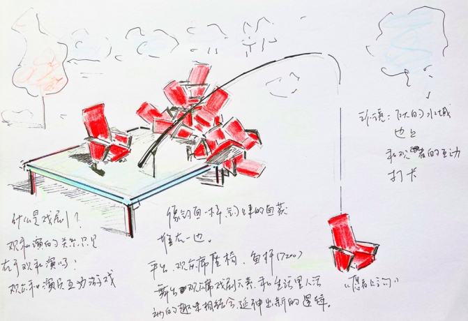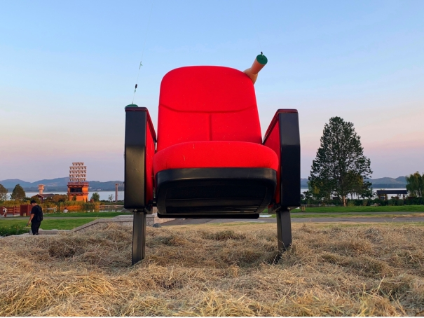 在尼山这块大水域前,剧场座椅和生活里人们的趣味相结合,延展出一个新的逻辑,座椅像鱼获一样被钓上来堆在一边,究竟谁是观众谁是演员?