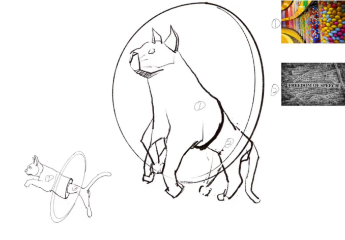 一只猫正在跳向穿越圈,一半身体已经变大且沾满了M记糖豆,一半身体还未发生改变且沾满了报纸文字。记录了在轻轻一跃过程中,发生的奇妙反应。