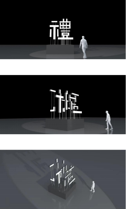 本作品将听觉的音乐感受与视觉的汉字“礼”相结合,从不同方向嵌入声音系统,虽然欣赏者在同一个空间中,但不同声 响方位可以听到不同的音乐。当欣赏者从正面欣赏“礼”字时,听到的是“正乐”。从两侧欣赏汉字时,分别听到不同时期的礼乐作品,实现了古今对话。
