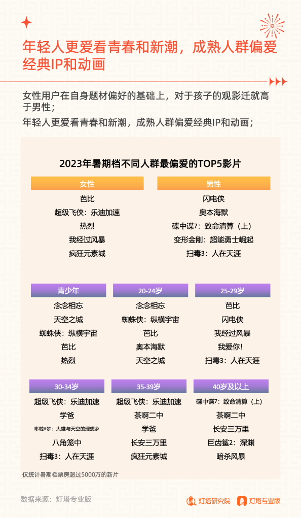 同日,灯塔研究院联合新华网发布《长风破浪,势不可挡——2023年暑期档电影市场洞察报告》,从市场大盘、用户画像、竞争格局、重点影片、城市影院等五大维度进行复盘分析。从分析报告看,暑期档表现强劲,三个“多”让人们对电影市场后续的表现充满期待。
