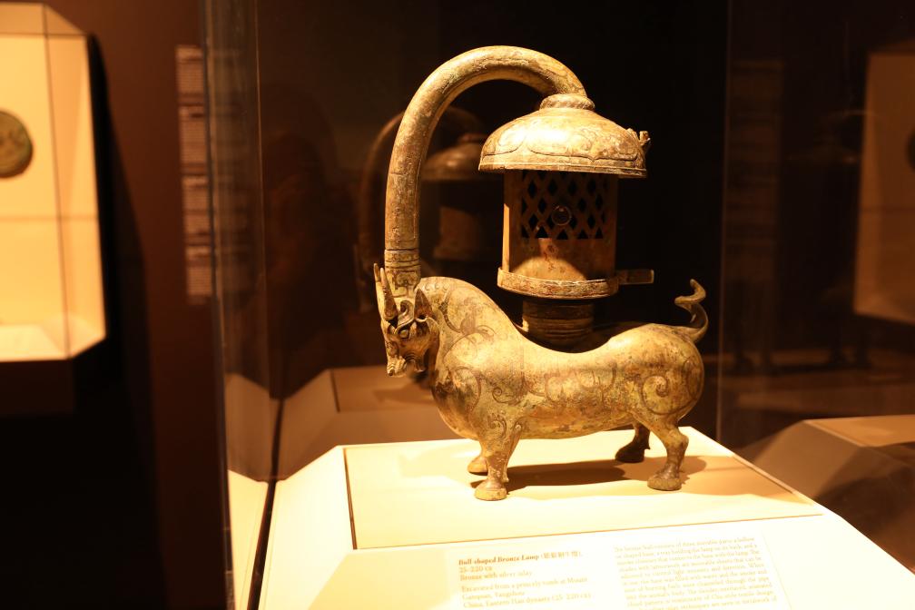 这是9月6日在美国俄亥俄州克利夫兰艺术博物馆“人间天堂:中国江南珍宝展”上展出的汉代错银铜牛灯。新华社记者施春摄