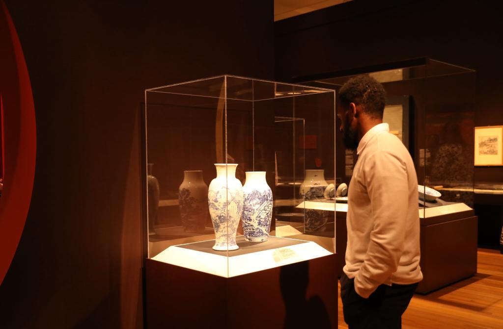 9月6日,在美国俄亥俄州克利夫兰艺术博物馆,一名男子参观“人间天堂:中国江南珍宝展”。新华社记者施春摄