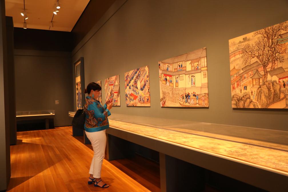 9月6日,在美国俄亥俄州克利夫兰艺术博物馆,一名女子参观“人间天堂:中国江南珍宝展”。新华社记者施春摄