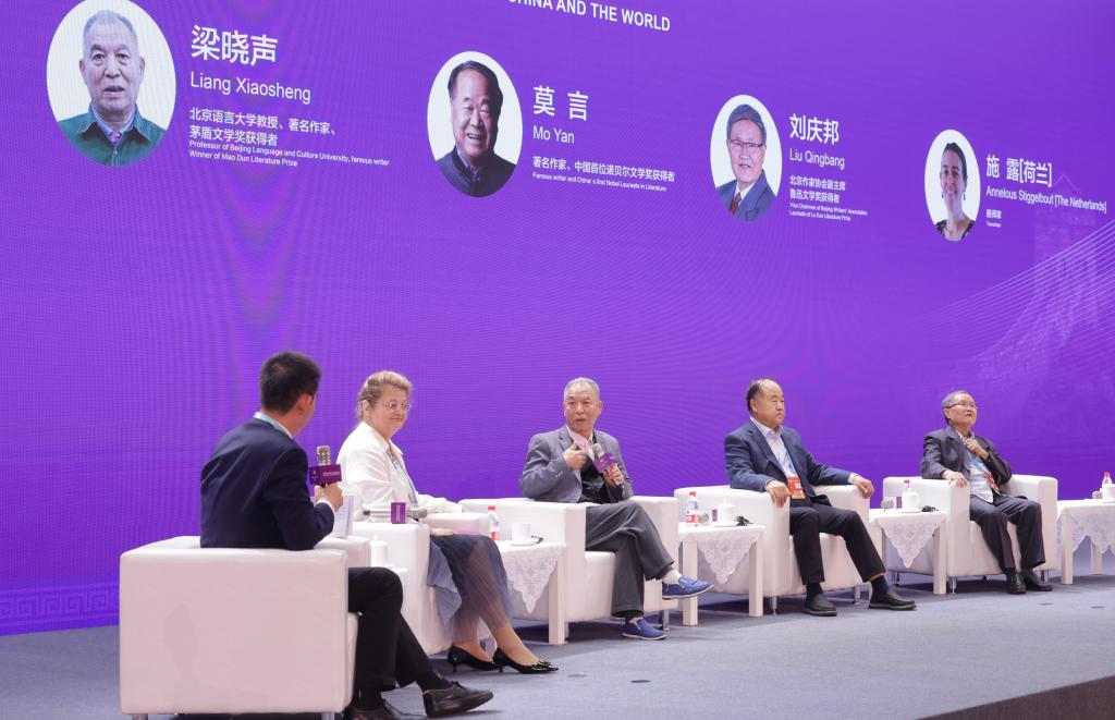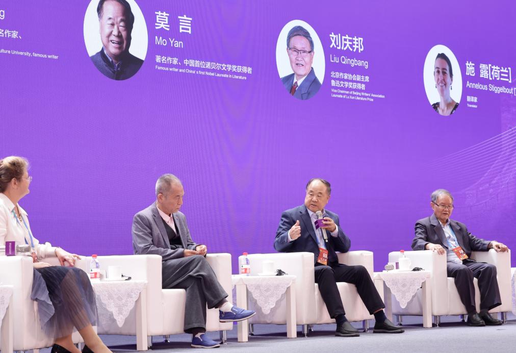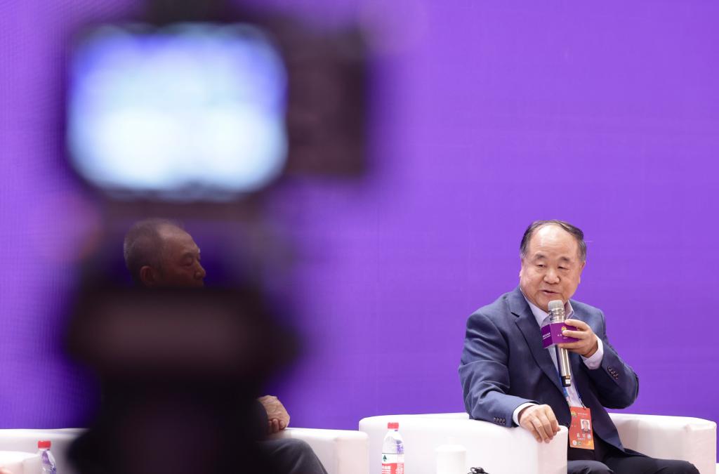 9月15日,作家莫言(右二)在“以文化人:文艺价值与社会生活”平行论坛的“中国文学与世界对话”圆桌对话现场发言。