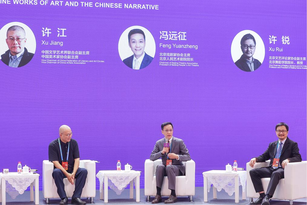 9月15日,北京人民艺术剧院院长冯远征(中)在“以文化人:文艺价值与社会生活”平行论坛的“文艺精品与中国叙事”圆桌对话现场发言。