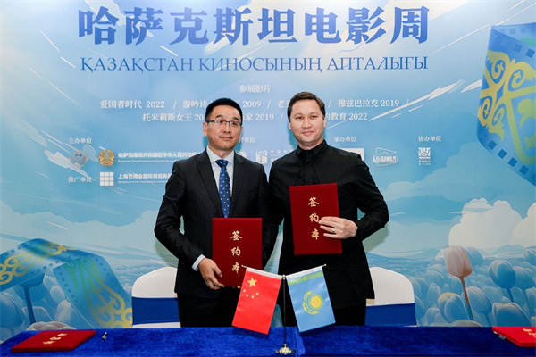 (左:壹家人文化集团总裁林进 右:哈萨克斯坦国家电影集团总裁阿扎玛特·萨特巴勒德)