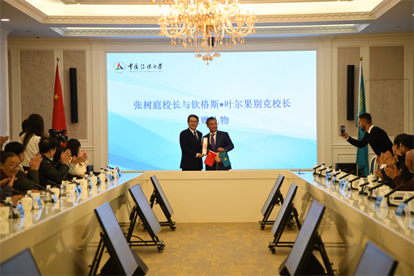 (左:中国传媒大学校长张树庭 右:铁穆尔别克·朱尔根诺夫哈萨克国立艺术学院院长钦格斯·叶尔果别克)