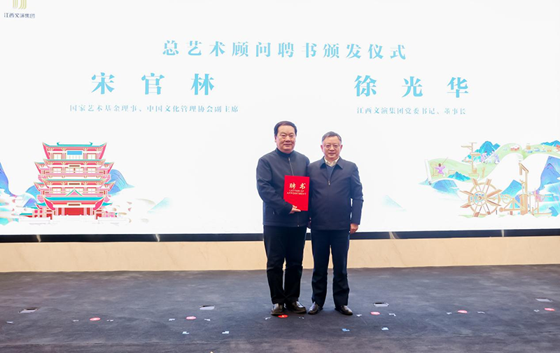 发布会现场,江西文演集团党委书记、董事长徐光华,为国家艺术基金理事、中国文化管理协会副主席宋官林颁发“影响世界的江西”系列舞台剧总顾问聘书。宋官林表示,非常荣幸能够以总顾问的身份,加入到“影响世界的江西”系列舞台剧创作中,相信未来以“影响世界的江西”系列舞台剧为代表的中国文艺创作会更加繁荣发展。