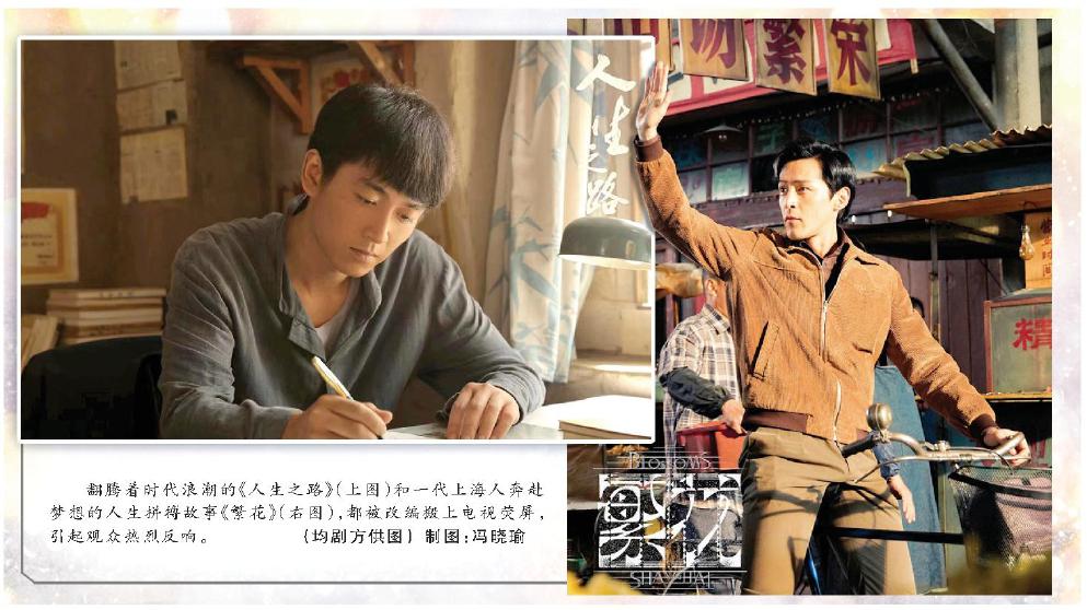 翻腾着时代浪潮的《人生之路》(上图)和一代上海人奔赴梦想的人生拼搏故事《繁花》(右图),都被改编搬上电视荧屏,引起观众热烈反响。 (均剧方供图)制图:冯晓瑜